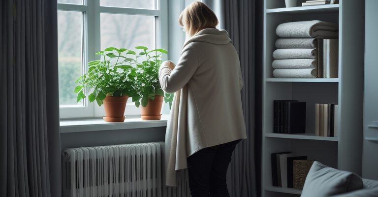 Prosty test szczelności okna wykonasz zapaloną świeczką — ruch płomienia wskaże nieszczelność. Wentylacja krótka i intensywna (5–10 minut z szeroko otwartymi oknami) wymienia powietrze bez znacznej utraty ciepła. Nie blokuj grzejników meblami; pozostaw 5–10 cm luzu, aby umożliwić swobodny przepływ powietrza.